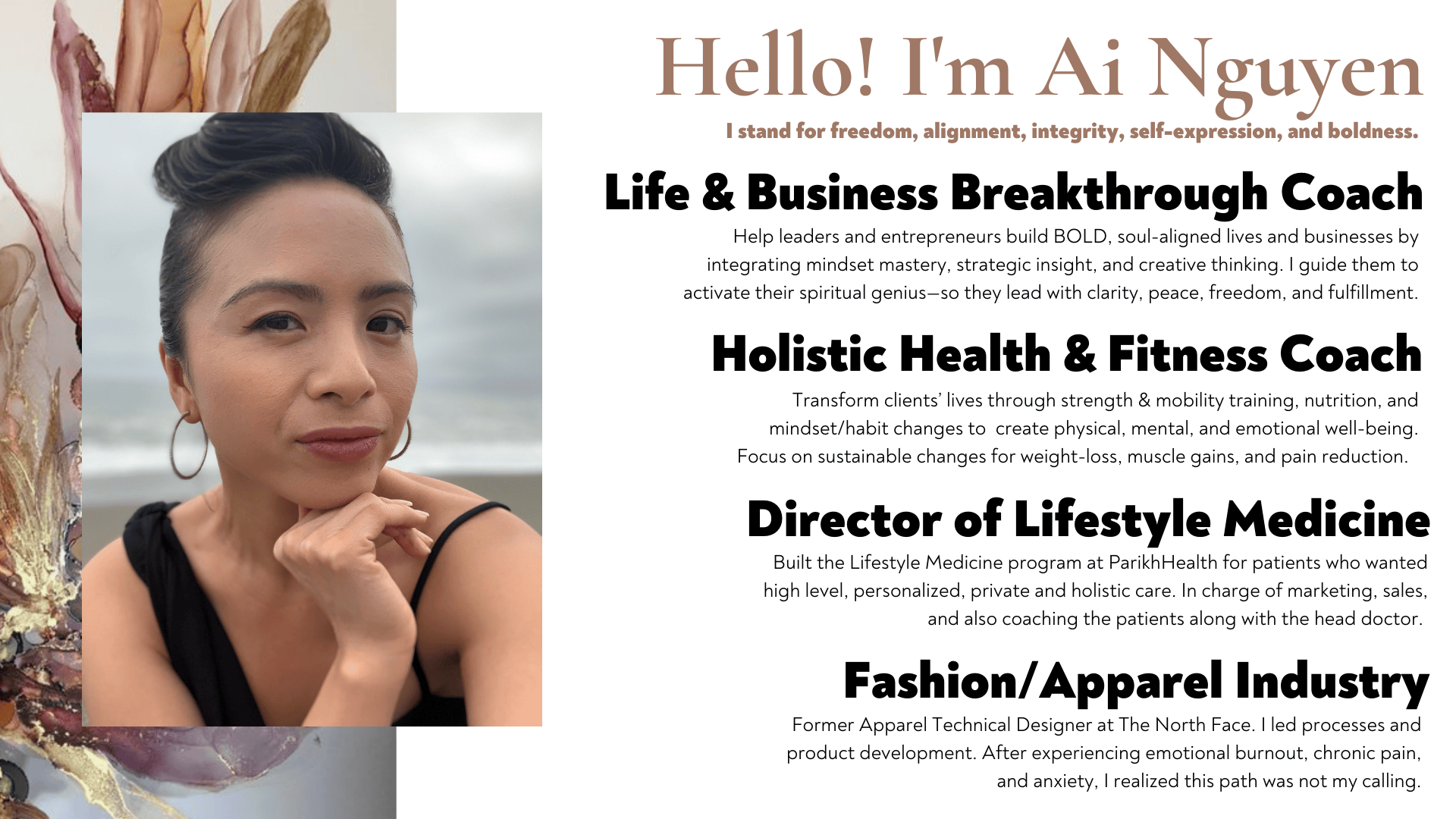 Disclaimer and Privacy Policy: by providing your email address, phone number, name, and/or submitting any forms connected to this business Discover You And Ai and it's owner Ai Nguyen,  then you agree to send your info to Ai Nguyen.  Your info will be used for the purposes of emails or creating connections with you, but you will not be spammed by us.   We respect your privacy and will not give away your personal information.